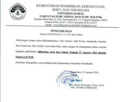 Jumat, 23-08-2024 - 15:16:39 WIB Riau12.com-PEKANBARU- Sivitas Akademika Fakultas Ilmu Sosial dan Ilmu Politik Universitas Riau (Fisipol Unri) yang tergabung dengan BEM akan menggelar aksi unjuk rasa, Jumat (23/8/2024). Sehubungan dengan kegiatan ini, seluruh perkuliahan di fakultas tersebut diliburkan mulai pukul 13.30 WIB.Pengumuman resmi terkait hal ini dikeluarkan oleh pihak...(read more)
