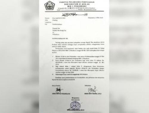 Sabtu, 18-05-2024 - 15:27:38 WIB Riau12.com-PEKANBARU- Wali murid atau orangtua dari siswa di Madrasah Ibtidaiyah Negeri (MIN) 1 Pekanbaru mengaku keberatan soal iuran yang ditetapkan untuk pelaksanaan perpisahan dan Khatam Quran yang akan dilaksanakan pada 29 Mei mendatang.Pasalnya, iuran yang harus dibayar orangtua kelas 6 untuk perpisahan dan khatam quran tersebut...(read more)