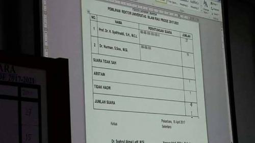 Selasa, 18-04-2017 - 16:32:04 WIB Riau12.com-PEKANBARU-Bertempat di gedung Pasca Sarjana Universitas Islam Riau (UIR), Prof DR H Syafrinaldi SH, MCL berhasil keluar sebagai rektor UIR yang baru, dalam sidang pemilihan yang diketuai oleh Sahrul Selasa (18/4/2017).Dalam sidang senat pemilihan Rektor UIR yang digelar tertutup tersebut, Syafrinaldi mampu mengumpulkan 27 suara....(read more)
