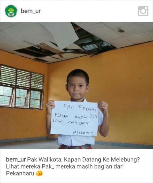 Kamis, 24-03-2016 - 13:05:05 WIB PEKANBARU,Riau12.com-Sebuah foto dengan obyek seorang murid SD memegang kertas putih bertuliskan "Pak Firdaus, kapan ke sini? Lihat Kami dong... Melebung". Latar belakang foto tersebut sebuah ruang kelas tanpa meja dan kursi dengan plafon di bagian sudut yang jebol. Sudah beberapa hari foto tersebut ramai dibahas pengguna media sosial di...(read more)
