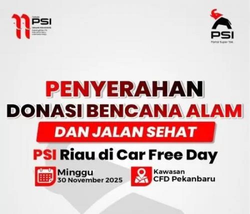 Rabu, 26-11-2025 - 09:17:47 WIB Riau12.com-Pekanbaru – Partai Solidaritas Indonesia (PSI) Riau bakal menggelar Fun Walk dalam rangka memeriahkan Car Free Day (CFD) di Kota Pekanbaru pada Minggu, 30 November 2025. Acara ini sekaligus menjadi bagian dari agenda Rapat Koordinasi Wilayah (Rakorwil) PSI Riau. Ketua Umum PSI Kaesang Pangarep dan Sekretaris Jenderal PSI Raja...(read more)