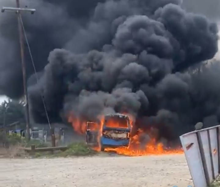 Mobil yang sehari-hari digunakan untuk mengangkut anak sekolah ini terbakar hebat di Jalan Lintas Sumatera, menyebabkan kemacetan sementara karena pengendara memilih berhenti di tepi jalan saat kejadian.