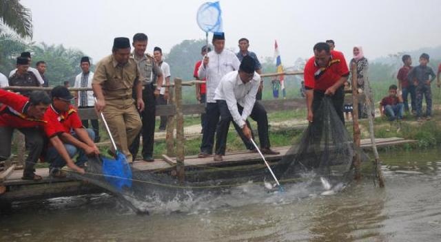 Bupati Rokan Hilir Suyatno saat panen ikan bersama masyarakat