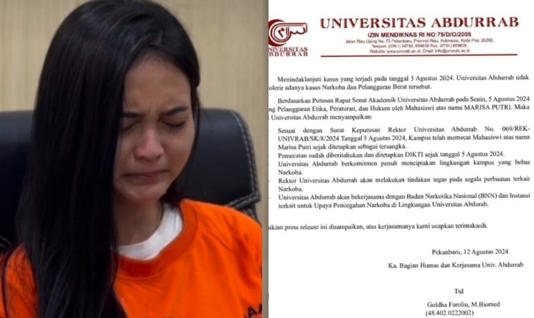 Riau12.com-PEKANBARU – Universitas Abdurrab, Pekanbaru, mengambil langkah tegas terhadap pelanggaran narkoba yang melibatkan salah satu mahasiswinya. Dalam press release yang dirilis pada Senin (12/8/2024), pihak universitas mengumumkan pemecatan mahasiswi bernama Marisa Putri, yang terlibat dalam kasus narkoba.