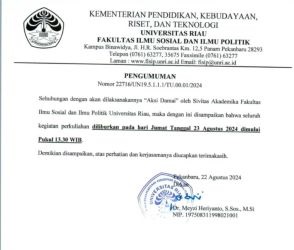 Riau12.com-PEKANBARU- Sivitas Akademika Fakultas Ilmu Sosial dan Ilmu Politik Universitas Riau (Fisipol Unri) yang tergabung dengan BEM akan menggelar aksi unjuk rasa, Jumat (23/8/2024). Sehubungan dengan kegiatan ini, seluruh perkuliahan di fakultas tersebut diliburkan mulai pukul 13.30 WIB.