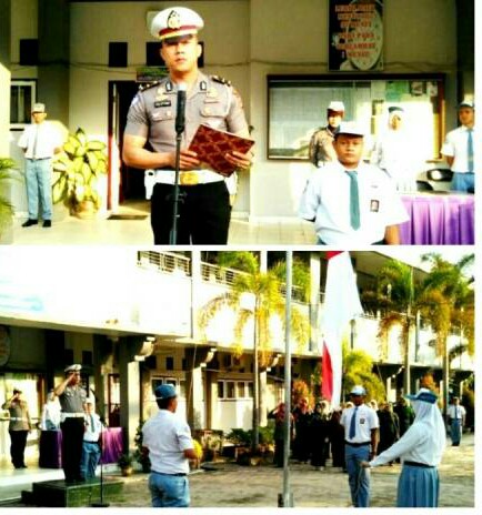 BANGKINANG KOTA,Riau12.com-Kanit Laka Satuan Lalulintas Polres Kampar menyampaikan tentang himbauan kepada seluruh peserta upacara di SMAN 01 Bangkinang saat menjadi Inspektur upacara, Senin (11/01/2016).