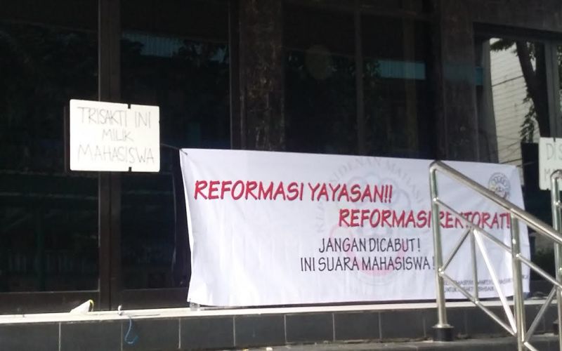 Adapun segel tersebut bertuliskan 'Trisakti Ini Milik Mahasiswa'. Tak hanya itu, terdapat pula spanduk yang bertuliskan 'Reformasi Yayasan, Reformasi Rektorat. Jangan Dicabut! Ini Suara Mahasiswa!'